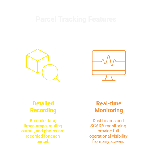 Every parcel processed through the sorter is recorded in detail — including barcode data, time stamps, routing output, and photo archiving. Real-time dashboards and SCADA monitoring provide full operational visibility from any screen.