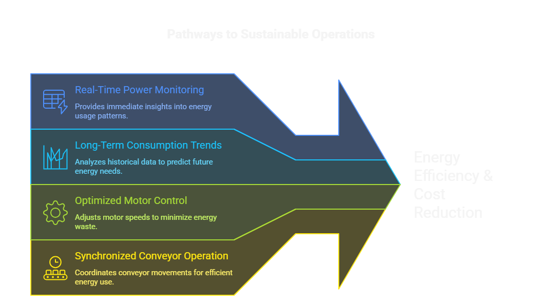 The integrated energy monitoring module reports real-time power usage and long-term consumption trends. Optimized motor control and synchronized conveyor operation help reduce electricity costs while maintaining consistent performance.