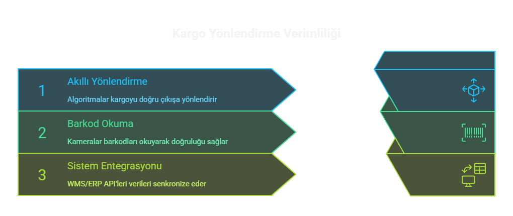 Akıllı yönlendirme algoritmaları, kamera tabanlı barkod okuma ve WMS/ERP API entegrasyonları sayesinde her kargo her zaman doğru çıkış noktasına yönlendirilir. Bu yapı; yanlış yönlendirme oranlarını en aza indirir, iade süreçlerini azaltır ve müşteri memnuniyetini artırır.