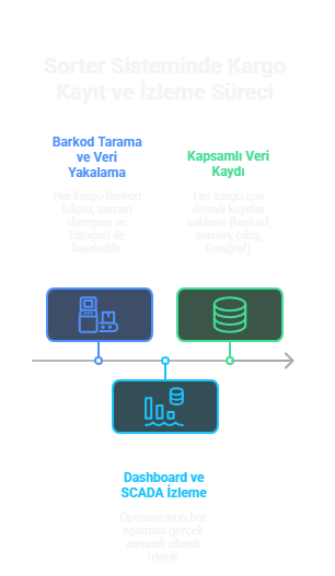 Sorter’dan geçen her kargo; barkod bilgisi, zaman damgası, yönlendirildiği çıkış ve fotoğraf kaydı dahil olmak üzere detaylı biçimde kayıt altına alınır. Gerçek zamanlı dashboard ekranları ve SCADA izleme altyapısı, operasyonun her aşamasını herhangi bir cihazdan tam görünürlükle takip etme imkânı sağlar.